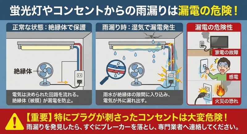 天井の照明や蛍光灯、コンセントから雨漏り!漏電・感電のリスクと「火災」を防ぐための緊急対応