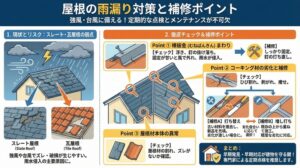 - 補修箇所の確認とチェック:まずは水の侵入箇所を明確にし、雨漏りの原因を調べることが大切です。目視で分からない場合は、濡れている部分やカビ、変色から判断します。