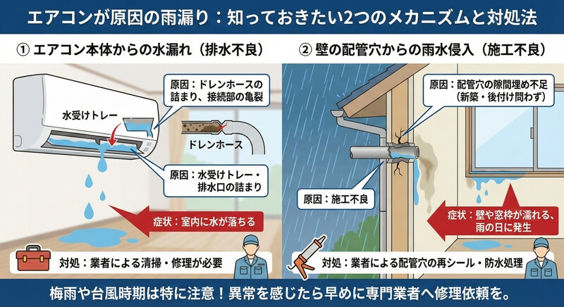 エアコンを使っていると、室内に快適な空気を供給する一方で、エアコンが原因で雨漏りが発生することがあります。