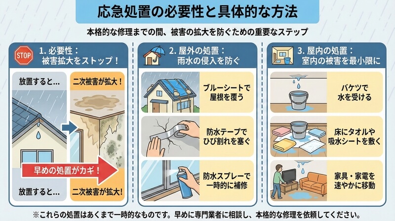 本格的な修理を行う前に、応急的な処置を施すことで被害の拡大を防ぐことが可能です。例えば、ブルーシートで屋根を覆い、防水テープや防水スプレーでひび割れを一時的に塞ぐなどの対応があります。また室内に雨水が垂れてきている場合は、バケツなどで受けるとともに、床にタオルや吸水シートを敷いて二次被害を最小限に抑えることが重要です。さらに水滴の下に家具や電化製品がある場合は速やかに移動させてください。