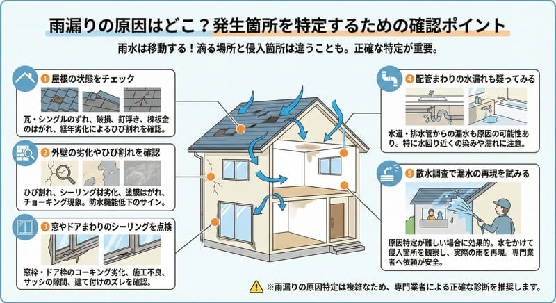 雨漏りが起きた際、その原因となっている箇所を正確に特定するのは意外と難しいものです。雨水は建物内部に入り込んだあと、屋根裏や壁の中を伝って移動するため、実際に水が滴っている場所と、侵入箇所が異なるケースも多く見られます。ここでは、雨漏りの発生源を特定するために確認すべき主なポイントを紹介します。