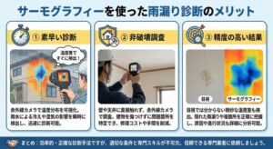 複数箇所から雨漏りしている場合にも同時に調べられる点や、雨が降っていても調査ができるなどのメリットがあります。