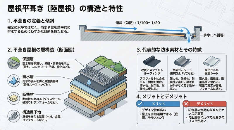 屋根平葺き、すなわちフラットルーフィングとは、特に現代建築でよく見られる屋根の形式です。この形式は、シンプルでモダンな外観が特徴であり、商業ビルや現代的な住宅に多く採用されています。屋根平葺きは、その施工方法やメンテナンスの容易さから、...