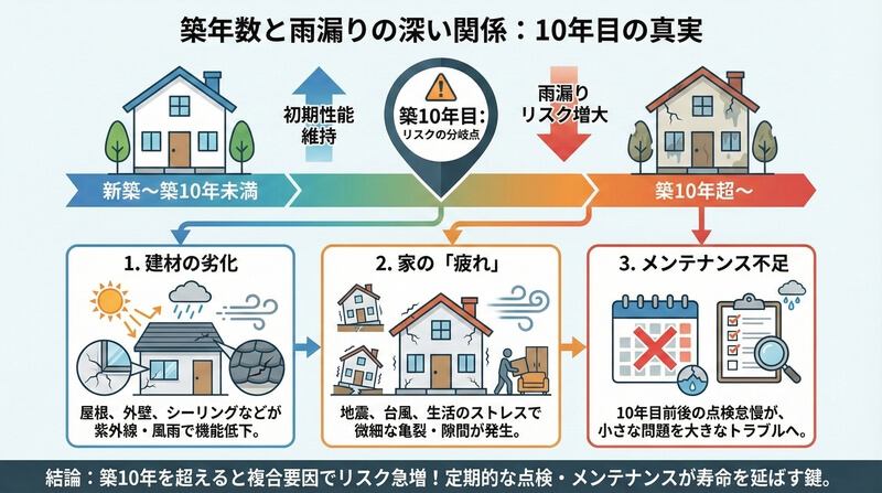 雨漏りは築何年目から起こる?築年数別に見る危険度とチェック方法【2026年版】