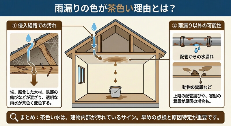 雨漏りで茶色い水は錆!?流れ出る雨水の色の原因は何なのか解説します【2026年版】