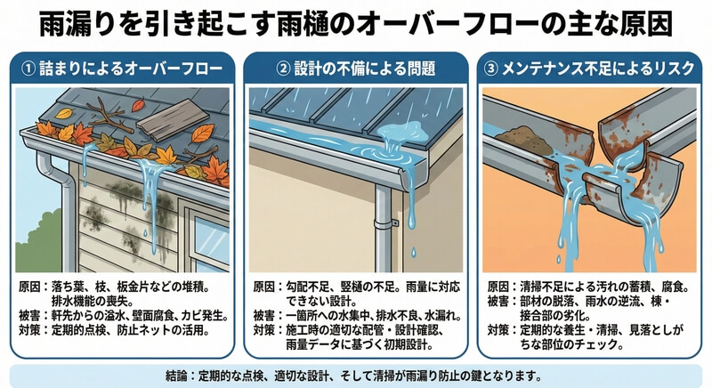 雨樋からの雨漏りはオーバーフローが原因!?放置リスクや修理費用についても徹底解説【2026年版】