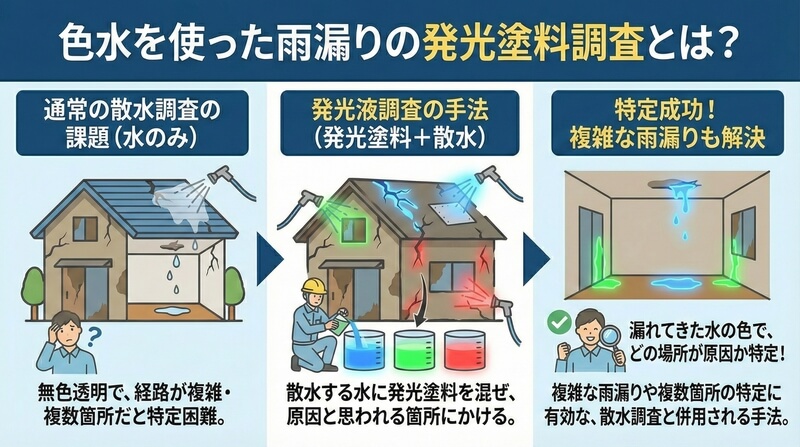 雨漏りの「発光液(色水)調査」は安全?跡が残らない理由と原因特定の重要性
