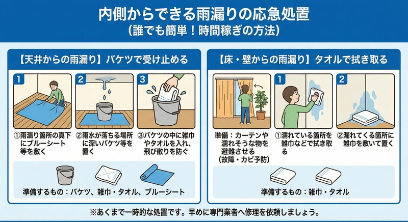 家の内側から雨漏り修理はできるの?受け皿を使った室内の応急処置を解説【2026年版】