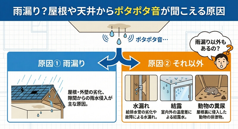 屋根や天井からポタポタと聞こえる雨音は雨漏り?音を消す方法と原因・対処方法を解説【2026年版】