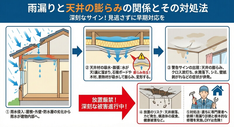 雨漏りによる天井の膨らみ!落ちる原因にも!?リフォーム修理と費用相場を解説【2026年版】