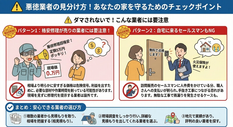 雨漏り修理の悪徳業者の手口・特徴!ぼったくりの見抜き方と対策・相談先について解説【2026年版】