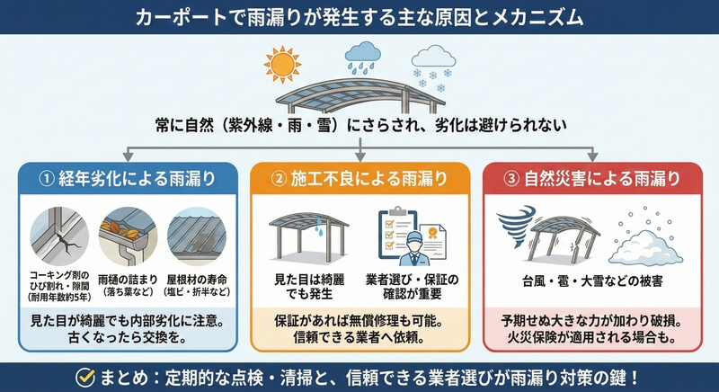 カーポートで雨漏りが発生する原因は大きく分けて3つあります。