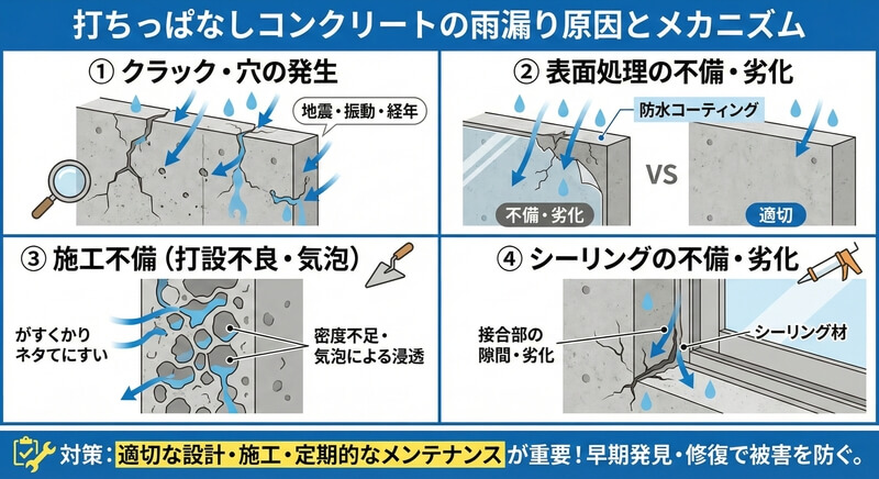 打ちっぱなしコンクリートの表面処理が不十分な場合、雨水の浸透が促進される可能性があります。例えば、適切な防水コーティングが施されていない場合や、防水処理の施工が不完全な場合は、雨水がコンクリート内部に浸透しやすくなります。また、表面処理の劣化や剥離も雨漏りの原因となります。