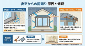 出窓は住宅のアクセントとして美しく、日差しを多く取り入れることができる魅力的な構造です。しかし、その構造上、雨風にさらされやすく、雨漏りが発生しやすい場所でもあります。この記事では、出窓からの雨漏りが起きる原因とその影響、応急処置の方法、コーキング材を使った補修の流れ、修理費用の目安、そして業者依頼のポイントまでを徹底解説します。家の外壁や屋根との接点にも関わるこのトラブルを放置してしまうと、建物全体に影響を及ぼす可能性があるため、早めの対策が大切です。