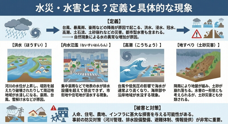 まず、水災・水害とは何を指すのか解説します。