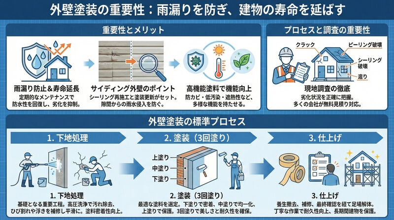 雨漏りを未然に防ぎ、建物の寿命を延ばすために欠かせないのが、外壁の塗装工事です。定期的なメンテナンスによって、防水性を回復し、外壁表面の劣化を抑えることができます。