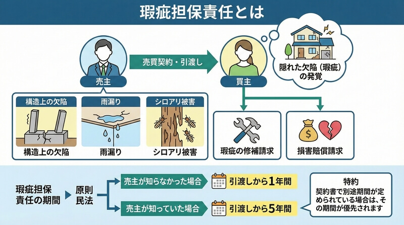 かつては、売主が見落としていた雨漏り等の不具合に対して、民法上「瑕疵担保責任」を負うとされていました。これは、目的物である住宅に隠れた瑕疵(欠陥)があった場合に、一定の期間内であれば売主が責任を取るという制度です。