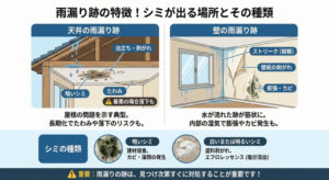 雨漏りが発生すると、建物内で様々な被害が生じる可能性があります。そのため、雨漏りのサインを見逃さないことが重要です。以下に、雨漏りの兆候をより詳しく説明しますので、これらが現れたら迅速に注意しましょう。