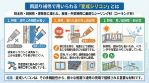 雨漏り補修とは?屋根や外壁の修理に使う変成シリコン・コーキング工事の方法を解説【2026年版】 家のメンテナンスは、その居心地と耐久性を保つ上で非常に重要です。中でも、雨漏りは家の構造に甚大な影響を与える問題です。この記事では、雨漏りの防止と修理におけ...