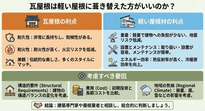 結局のところ、瓦屋根を軽い屋根材に葺き替えるかどうかは、上記の要因を総合的に考慮し、建築専門家や屋根業者と相談することが重要です。彼らは建物の現状や地域の条件に基づいた最適なアドバイスを提供できるでしょう。