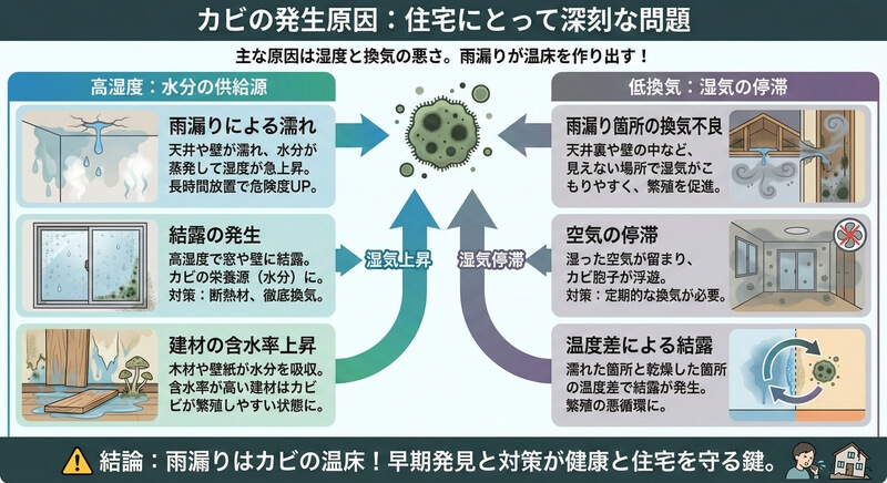 カビは、私たちの身近に存在する微生物ですが、その繁殖は住宅にとって深刻な問題を引き起こします。カビの発生原因は、主に湿度と換気の悪さですが、雨漏りはこれらの条件を満たす環境を作り出し、カビの温床となる可能性があります。