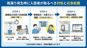 このように、雨漏りの原因が何であれ、対応の早さと適切な報告がトラブル防止の鍵になります。