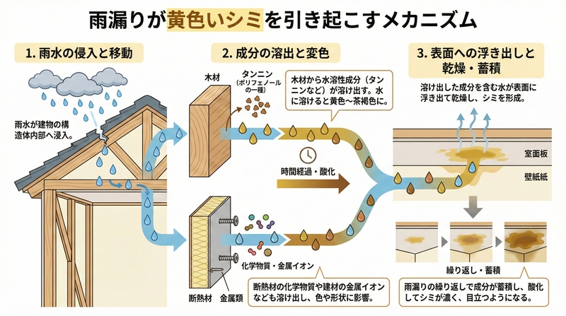雨漏りが黄色いシミを引き起こすメカニズム