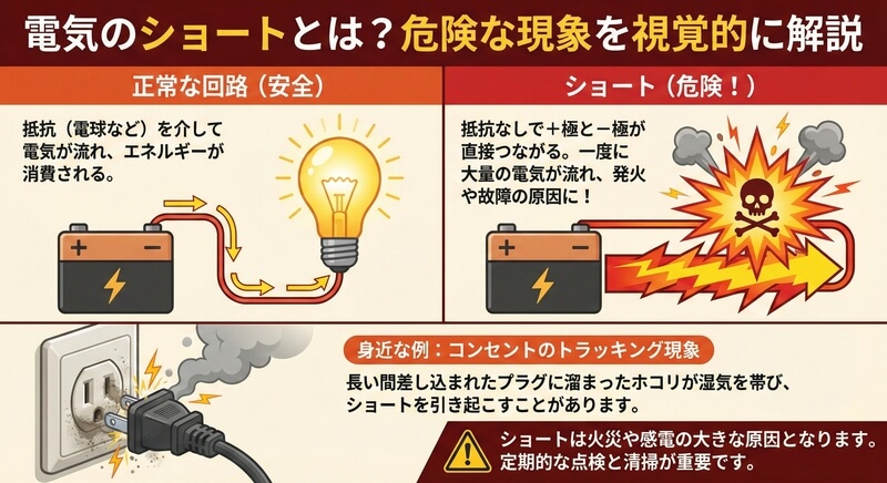 電気がショートするとは?ショートとは、抵抗を介さずに電源の+極と−極をつなぐと起きる現象です。極どうしを直接つなぐと、電気の流れをせき止めるものがない回路ができあがるため、極から極へと一度に大量の電気が流れてしまいとても危険な状態になるのです。