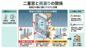また、施工不良によって雨水の流れが悪くなり、サッシまわりに水が溜まりやすくなることもあります。防水処理が不十分だった場合や、外壁塗装との取り合い部分にズレが生じてしまうと、雨が内部に入り込む可能性が高まります。強風時には通常よりも雨水の浸入リスクが増し、サッシの下部や枠の接合部など、細かい部分からも漏れやすくなります。