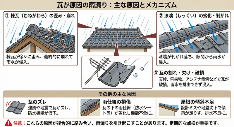 瓦屋根の問題点が雨漏りを引き起こす原因になる場合があります。以下にその主な問題点を挙げます。