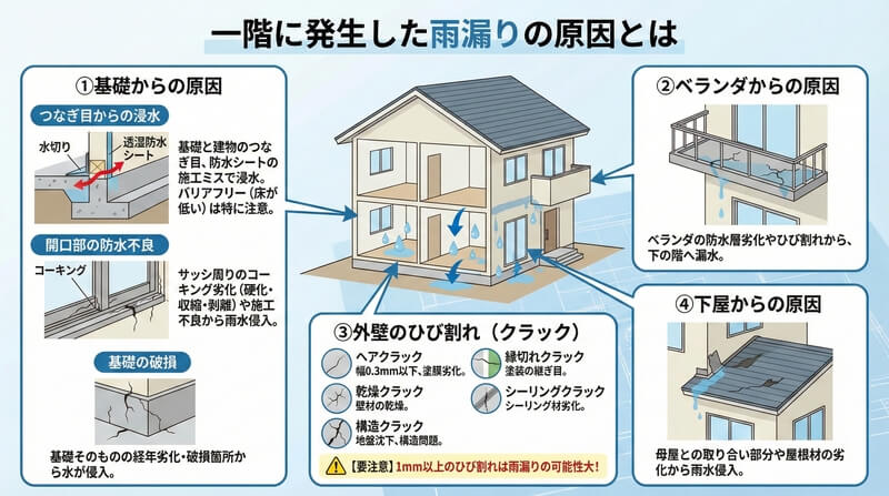 1階の天井雨漏りの発生場所はベランダや外壁のひび割れ、コーキング、下屋、基礎が原因で起きている場合が多いです。
