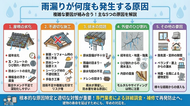 雨漏りが繰り返し発生する原因は多岐にわたり、建物の構造や環境、過去の修理履歴など、様々な要因が複雑に絡み合っています。主な原因としては、以下の点が挙げられます。