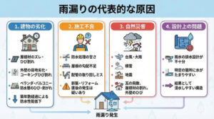 雨漏りというのは、単に「雨が家の中に入ってくる現象」と捉えるだけでなく、それを引き起こす背後に潜むさまざまな原因を理解することが重要です。ここで取り上げる主な原因を、より深く掘り下げて解説します。