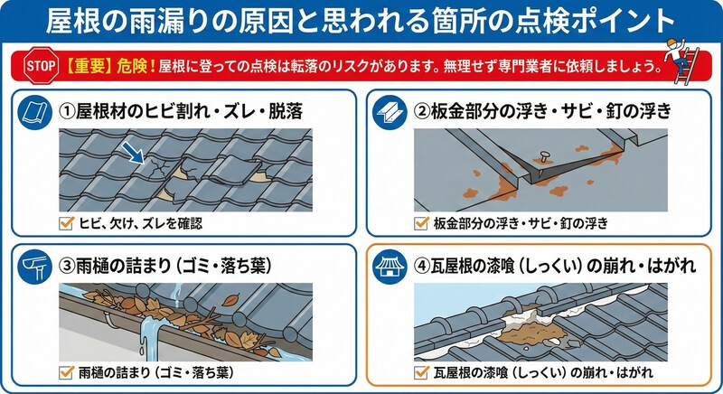 屋根の雨漏りの原因と思われる箇所の点検ポイント
