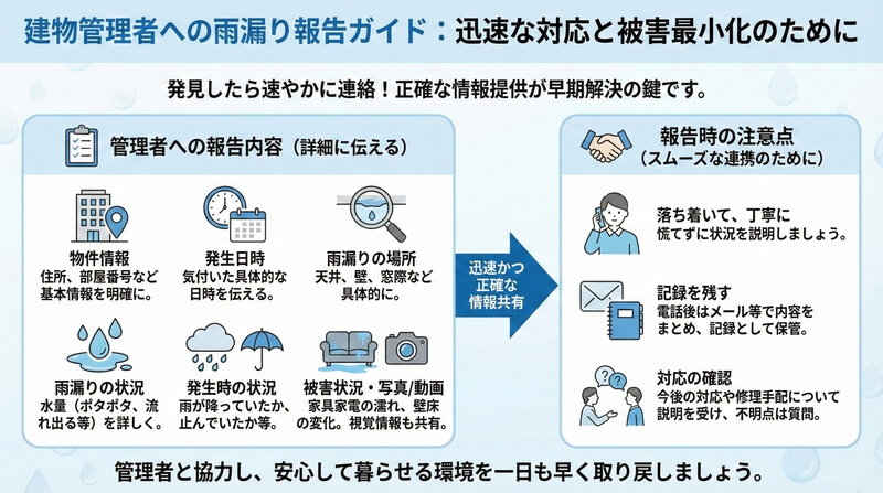 - 管理者への報告: 雨漏りを発見したら、速やかに管理会社または大家に連絡し、状況を報告します。