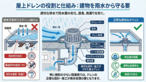また、排水ドレンやバルコニーの排水溝がゴミや葉っぱで詰まると、水が逆流してエアコンの配管や室内の壁内に雨水が流れ込むケースも確認されています。こうした現象は目に見えにくい場所で発生しやすいため、症状が現れたときには既に内部が腐食していたり、カビが発生していたりする可能性もあります。