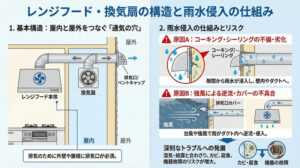 - 接続部分の緩みや隙間:ダクトの接続部分が緩んだり、隙間ができたりすると、そこから雨水が浸入してくることがあります。地震や振動によって、接続部分がずれることもあります。
