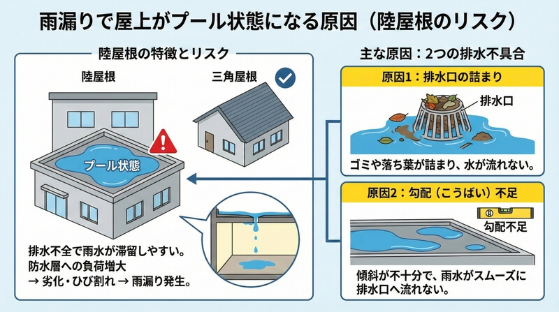 屋上があるタイプ、いわゆる「陸屋根(りくやね)」のお住まいでは、一般的な三角屋根に比べて雨漏りのリスクが高くなる傾向があります。その主な理由のひとつが、排水機能に不具合が生じることで屋上に雨水が溜まりやすくなる点です。屋上に雨水がスムーズに流れずに残ってしまうと、まるでプールのように水が溜まった状態になります。このような状態が続くと、防水層にかかる負荷が大きくなり、やがて劣化やひび割れを引き起こし、そこから雨漏りが発生してしまうケースが少なくありません。