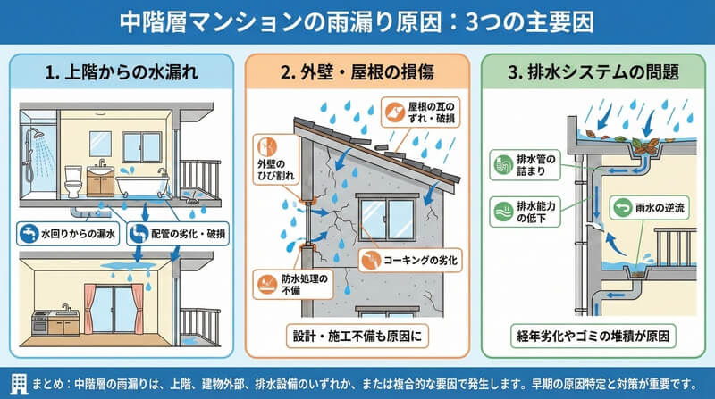 中階層のマンションで雨漏りが発生する原因は、大きく3つに分類できます。