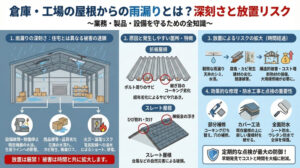 折半屋根は構造上、どうしても雨漏りのリスクがつきものです。しかし、定期的なメンテナンスや早期対応を行うことで、大きなトラブルに発展する前に防ぐことが可能です。特に、ビスやシーリングの劣化、排水不良、錆などの初期サインを見逃さないことが、建物の寿命を守るためのポイントです。