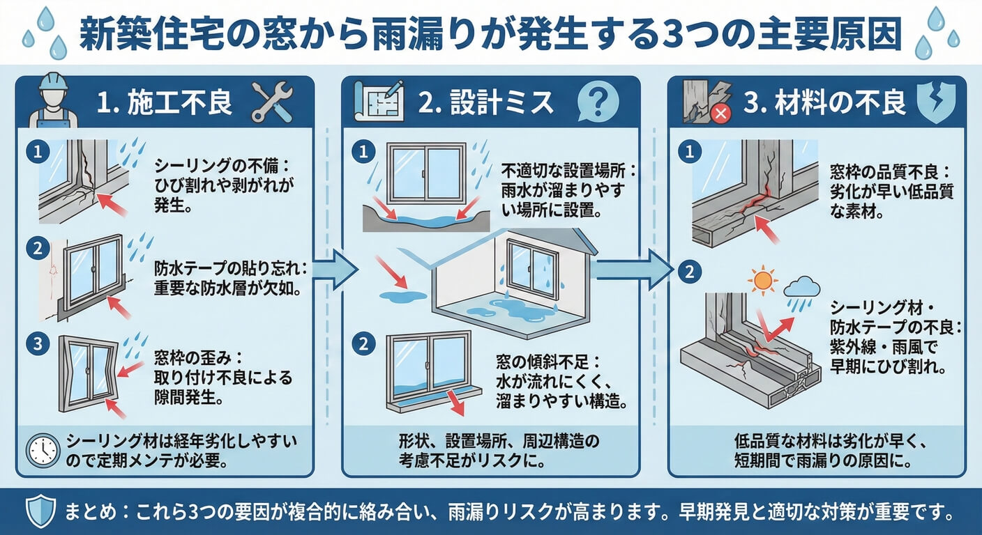 新築住宅の窓から雨漏りが発生する原因は、主に施工不良、設計ミス、材料の不良の3つが挙げられます。
