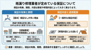 また、「住宅瑕疵担保履行法」に基づいて、事業者が資力確保措置(保険加入または供託)を取っていることも、万が一の補償の鍵となります。