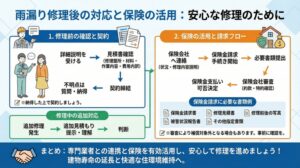 また、火災保険に加入している場合、台風や豪雨による雨漏りは保険対応が可能な場合もあります。保険内容に応じて費用の一部または全額がカバーされることもあるため、保険の利用についても相談すると良いでしょう。