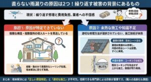 さらに、修理後に雨漏りが再発するリスクとその対策についてもお話しします。