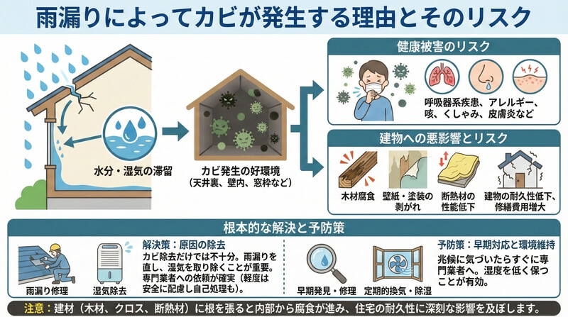 カビと雨漏りが引き起こす健康リスクとは?早期対策で守る家族の暮らし【2026年版】 住宅内で発生するトラブルの中でも、雨漏りとカビは見逃せない問題です。一見すると建物の劣化や見た目の損傷だけのように感じられるかもしれませんが、実はこれらが引...