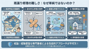 雨漏り修理は「その場しのぎ」ではなく、「長く安心できる家を守る」ための工事です。費用と保証のバランスを考えながら、納得のいく選択をすることが大切です。