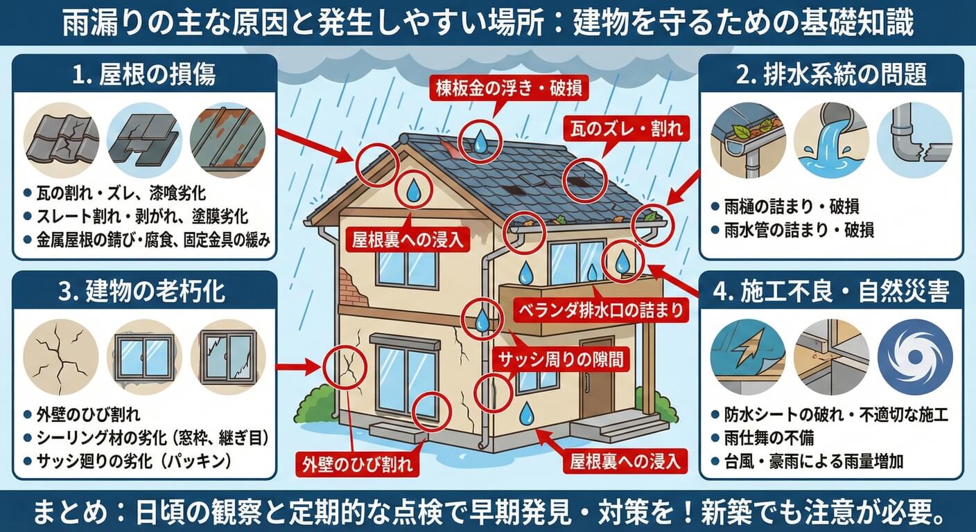 雨漏りの原因は、建物の構造、材質、経年劣化、施工不良、自然災害など、多岐にわたります。その中でも特に注意が必要な主な原因を詳しく見ていきましょう。