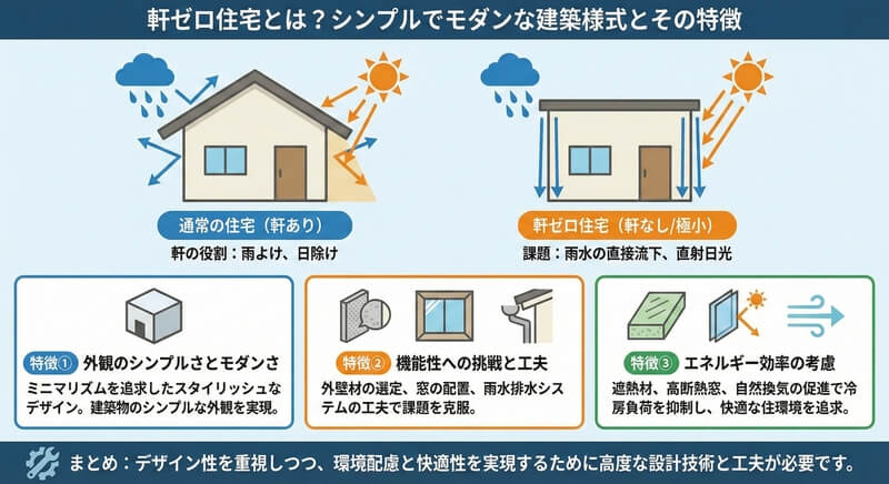 - 機能性への挑戦: 軒がないことで生じる雨水の直接流れ落ちや、夏季の日差しの直射などの問題を、建築設計の工夫により克服します。例えば、外壁材の選定や、窓の配置とサイズ、雨水排水システムの工夫などが挙げられます。