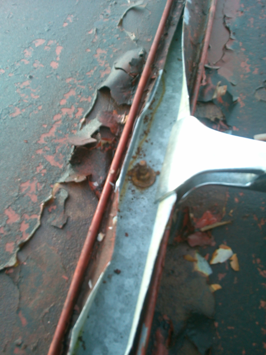 作業はまず、既存の瓦棒の一部を切り取り、下地の状態を確認しました。すると、昔ながらの方法で、鉄骨の上に瓦棒が葺かれ、ボルトとナットで固定されていることがわかりました。