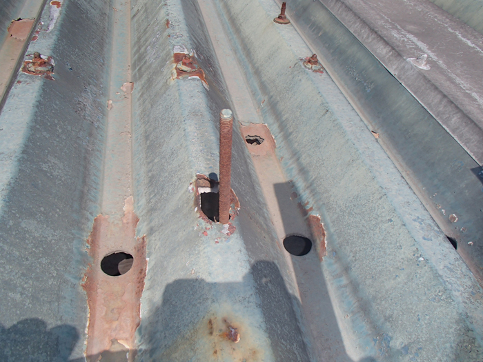 屋根の状態も同様に悪く、雨樋の排水用の穴周辺だけでなく他の部分でも錆びて穴が開いている箇所が多数ありました。特に雨樋を固定している部分の屋根には穴が開いていることが判明しました。